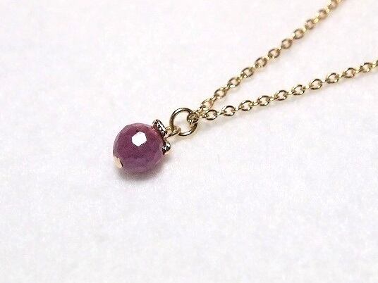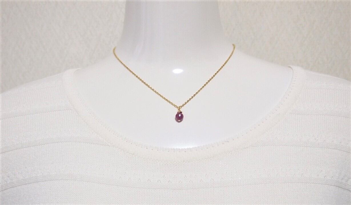 パープルがかった濃いピンクの小さめ宝石質ルビーのシンプルな一粒ネックレス。