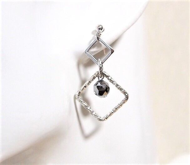 ダブルのスクエアパーツとメタリックブラックのキラキラしたテラヘルツストーンが耳元で揺れて、おしゃれを引き立ててくれるカジュアルなピアス。