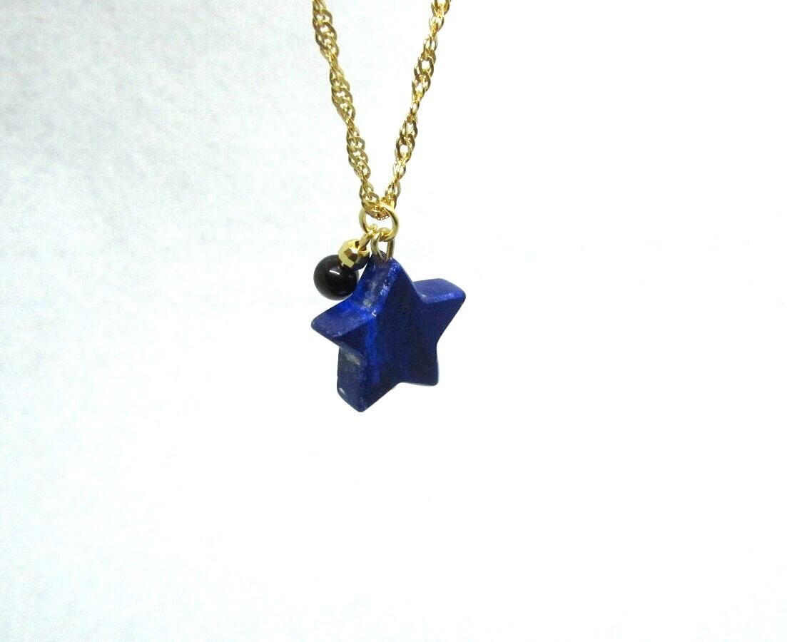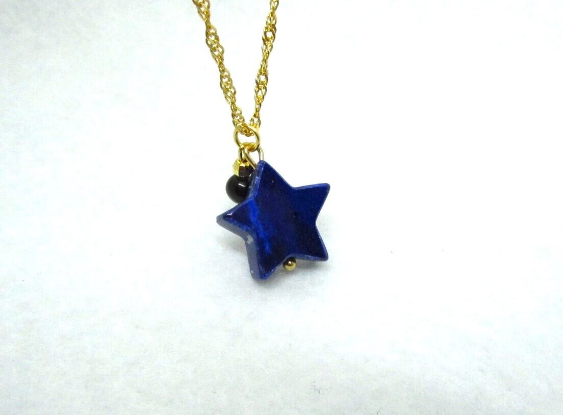 存在感のある少し大きめで厚みのあるウルトラマリンブルーの星形ラピスラズリと漆黒の小粒モリオンを組み合わせたデザインネックレス。