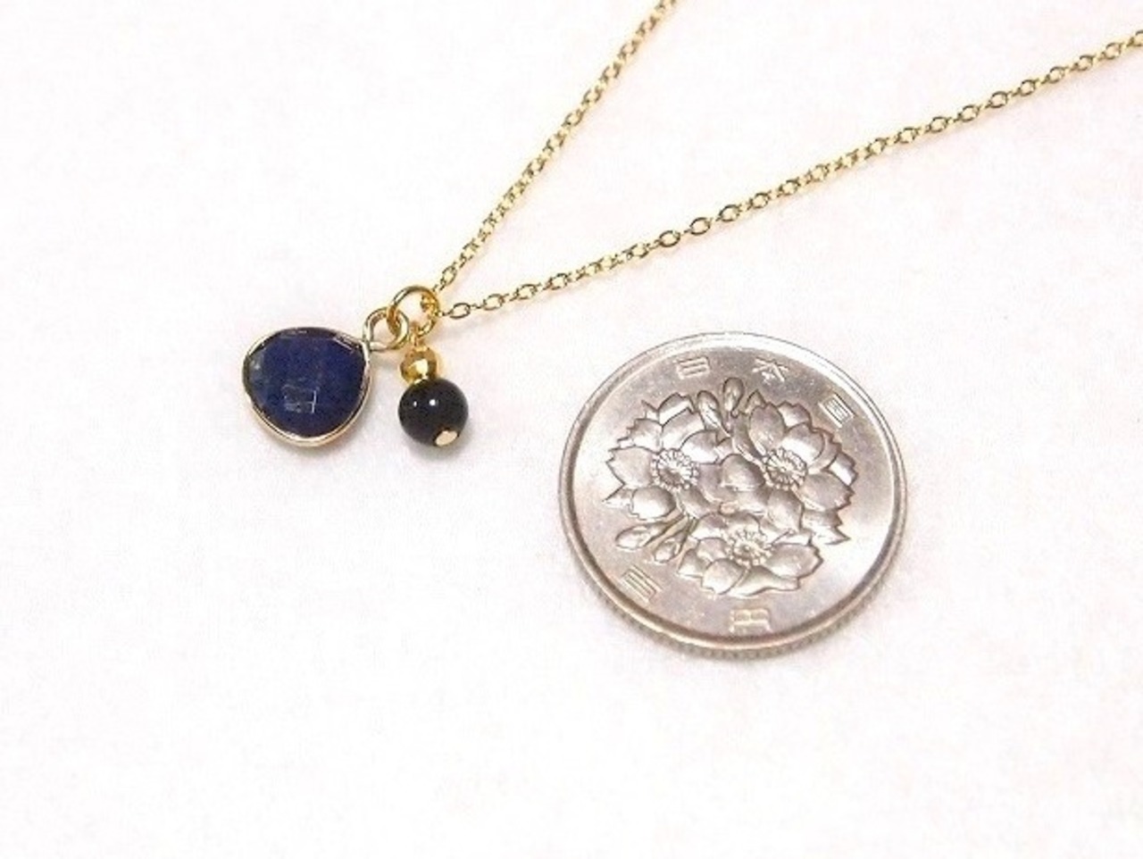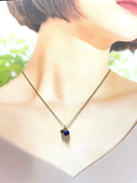 表面にカットの入ったマロン形のウルトラマリンブルーの可愛いラピスラズリと漆黒の小粒モリオンを組み合わせたシンプルなデザインネックレス。