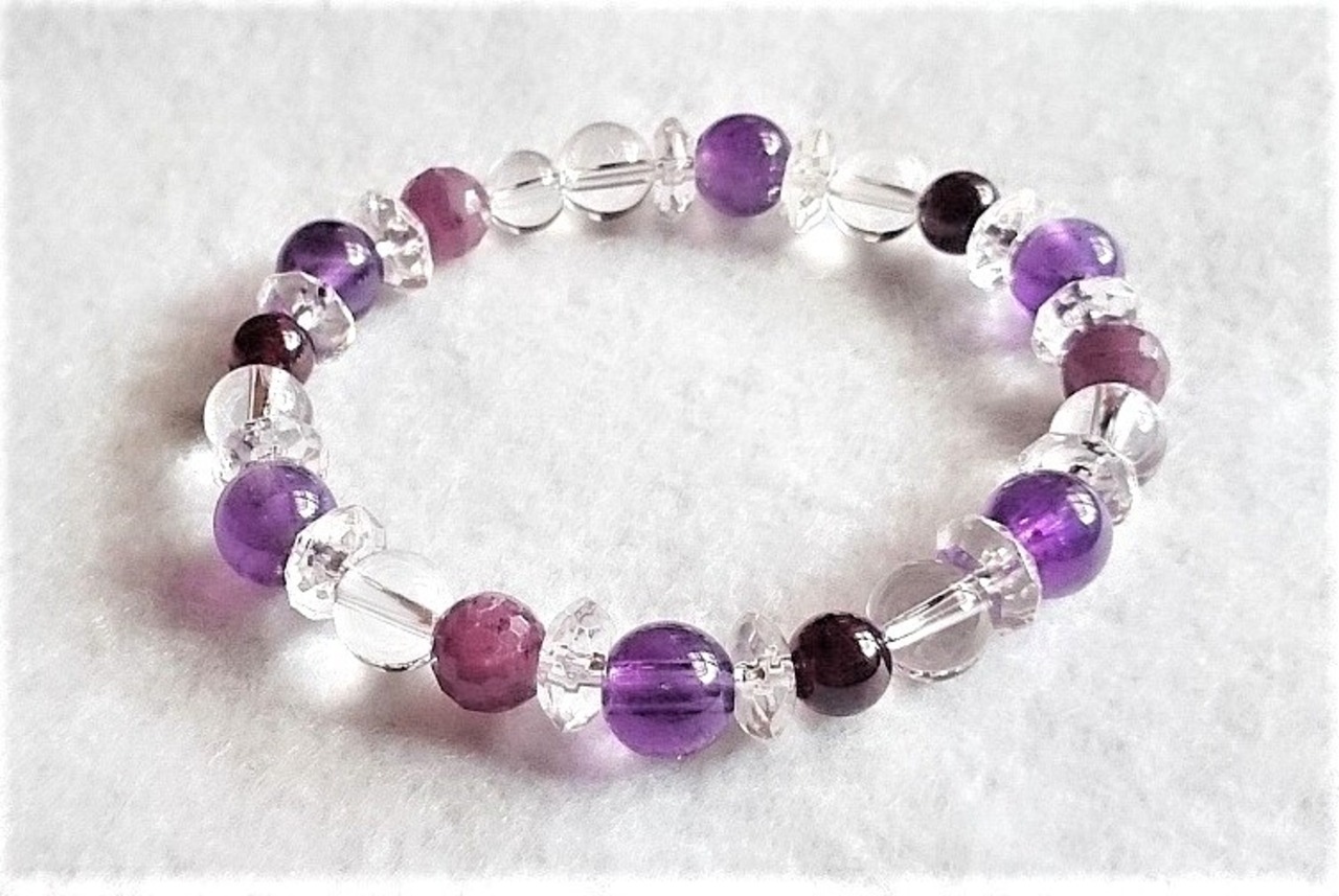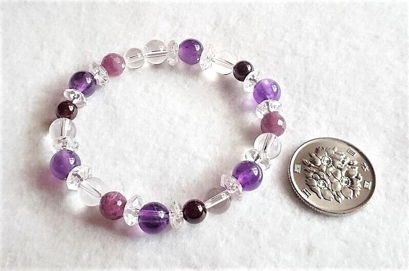 牡丹色のキラキラカットルビーと、濃い赤色のガーネットと紫色のアメジストにキラキラボタンカット水晶を組み合わせたデザインブレスレット。