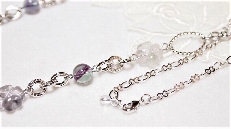 クローバー形のフローライトを使用したパープルカラーベースの当店オリジナルロングネックレス。