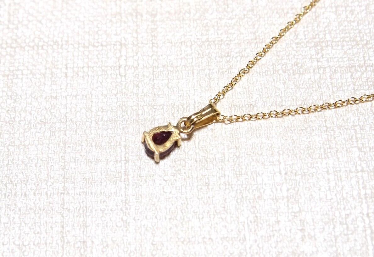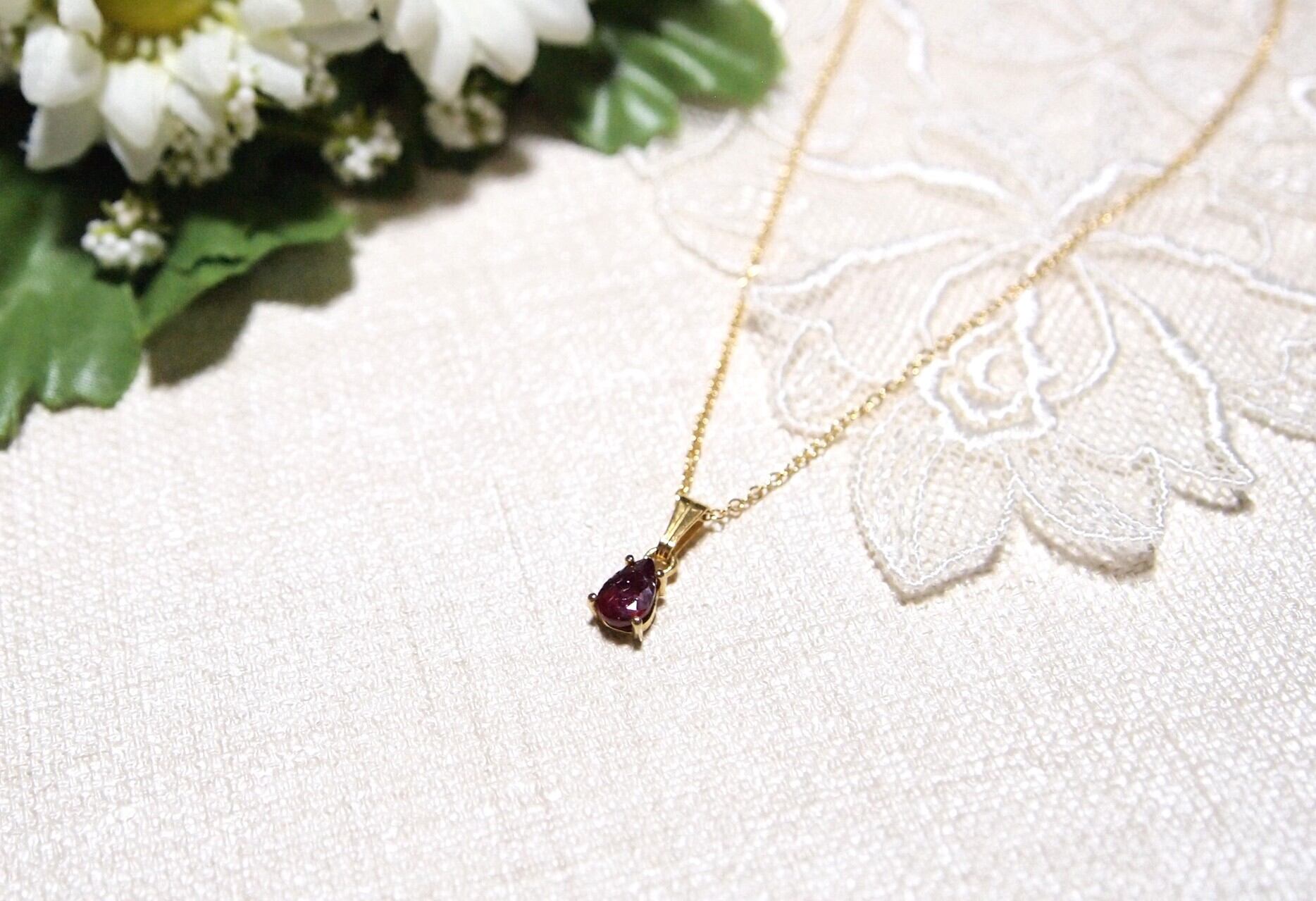 パープルがかった濃いピンクの小さめドロップ形宝石質ルビーの一粒ネックレス。